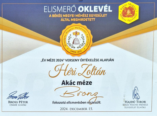 2024-ben "az év kiváló magyar méze-bronz fokozat" elismerést kapta a legnevesebb Gyulai mézversenyen!