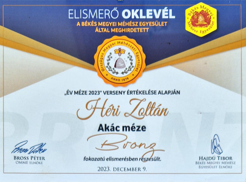 2023-ben "az év kiváló magyar méze-bronz fokozat" elismerést kapta a legnevesebb Gyulai mézversenyen!