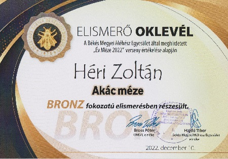 2022-ben "az év kiváló magyar méze-bronz fokozat" elismerést kapta a legnevesebb Gyulai mézversenyen!