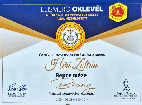 2025-ben "az év kiváló magyar méze repceméz kategória III. helyezés díjazásban részesült.