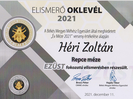 2021-ben "az év kiváló magyar méze-ezüst fokozat" elismerést kapta a legnevesebb Gyulai mézversenyen!